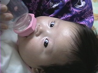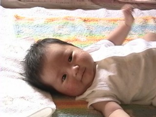 2000年11月 3か月 ちょっとだけ頭が上がるようになりました。 これはその時の写真判定です。 毎日毎日少しづつですが、確実に成長していくんですね。嬉しそうに手足をバタバタ動かしていました。 |