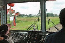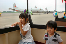 航空祭では大人気で乗れない花電車も乗り放題です。 地上に並ぶ機体を間近に走るのでパパもついつい夢中になってしまします。 |