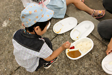 こちら大人気のカレー、お値段も200円とかなりリーズナブル。100人近い行列に並んで3個GET。他に海軍やきそば200円もおいしそうでした。。。 |