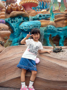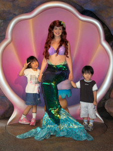 アリエルのグリーティンググロットでは自分達のカメラを使って、一緒に記念写真を撮ってもらうことがきでます。ただしチャンスは1回きりなので目をつぶらないように細心の注意が必要です。(有償の写真サービスもあります。) なつみはアリエルに会えて嬉しそうでした。実はここは50分待ちで、今回最も時間を注いだ人気スポットなのでした。 |