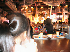 暗くなってきました。「おうちに帰りたーい」という子供達をたしなめ、夜のイベントを見なくては元がとれません。。。 光るおもちゃを買ってご機嫌とり中。 |
